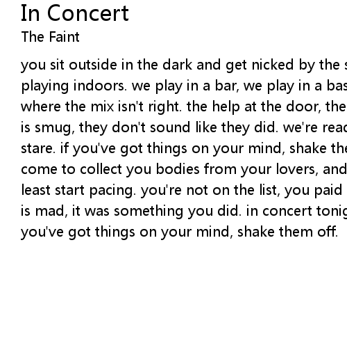 you sit outside in the dark and get nicked by the strobe light while we're playing indoors. we play in a bar, we play in a basement. we play in a room where the mix isn't right. the help at the door, the age to get in, the artist is smug, they don't sound like they did. we're ready to move, the crowd is a stare. if you've got things on your mind, shake them off. that's why we have come to collect you bodies from your lovers, and pause all the suffering... at least start pacing. you're not on the list, you paid to get in. your boyfriend is mad, it was something you did. in concert tonight, the bass drum is quick. if you've got things on your mind, shake them off.