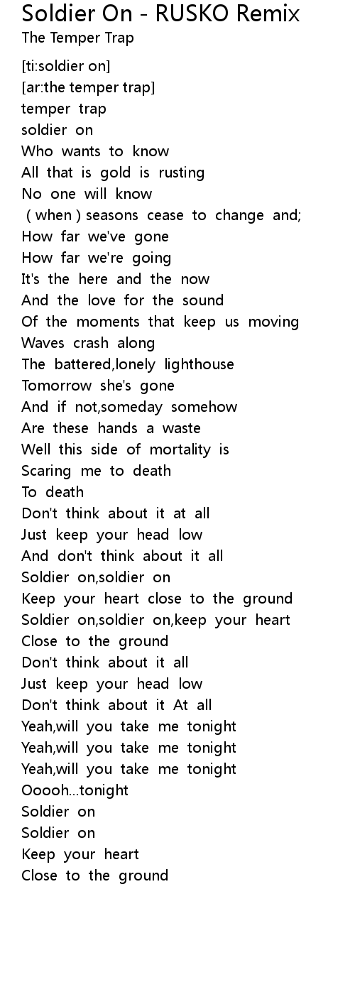 | [03:11.384] | Soldier on, soldier on, keep your heart |