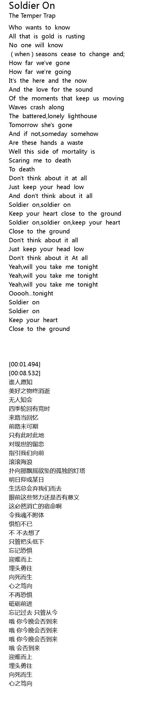 | [03:11.384] | Soldier on, soldier on, keep your heart |