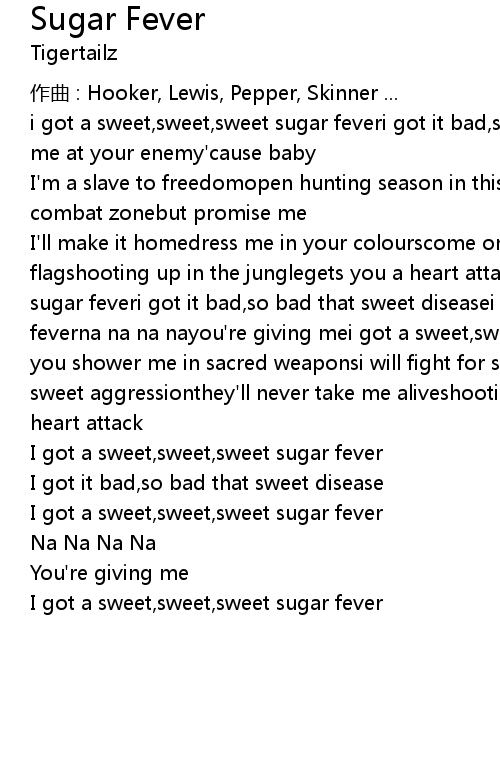 | I'll make it homedress me in your colourscome on bless me underneath the flagshooting up in the junglegets you a heart attacki got a sweet,sweet,sweet sugar feveri got it bad,so bad that sweet diseasei got a sweet,sweet,sweet sugar feverna na na nayou're giving mei got a sweet,sweet,sweet sugar feveron won't you shower me in sacred weaponsi will fight for soul possessioni'm a slave to sweet aggressionthey'll never take me aliveshooting up in the junglegets you a heart attack | |