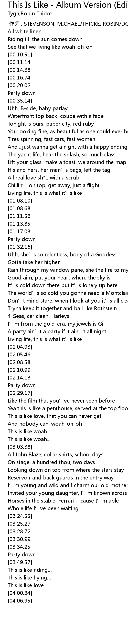 | [00:00.00] | 作词 : STEVENSON, MICHAEL/THICKE, ROBIN/DOMAN, DAVID/MALARKEY |