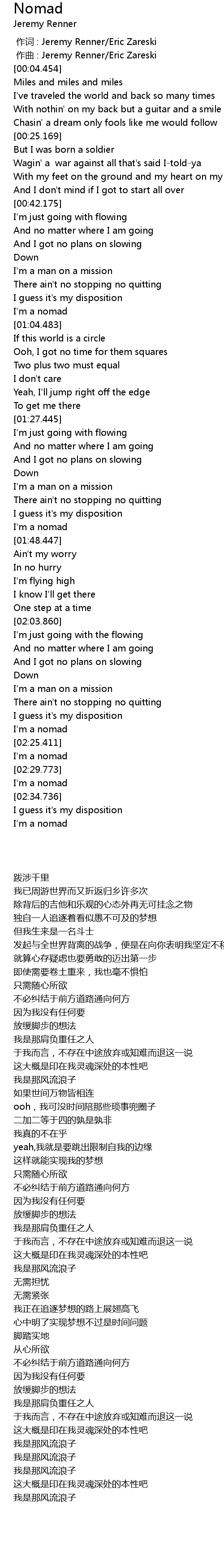 | [00:00.000] | zuò cí : Jeremy Renner Eric Zareski |