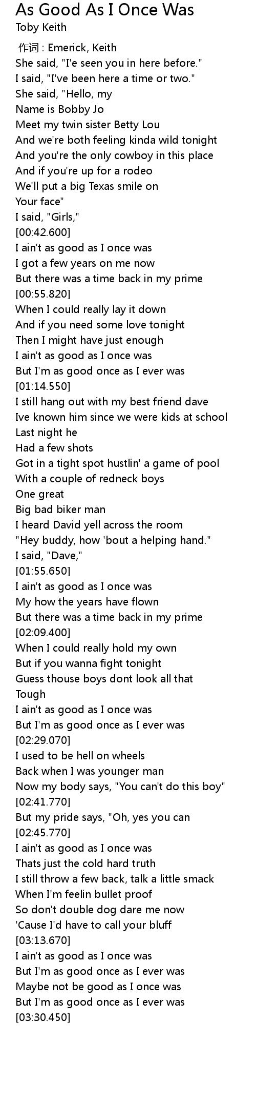 | [00:43.430] | I ain't as good as I once was |
