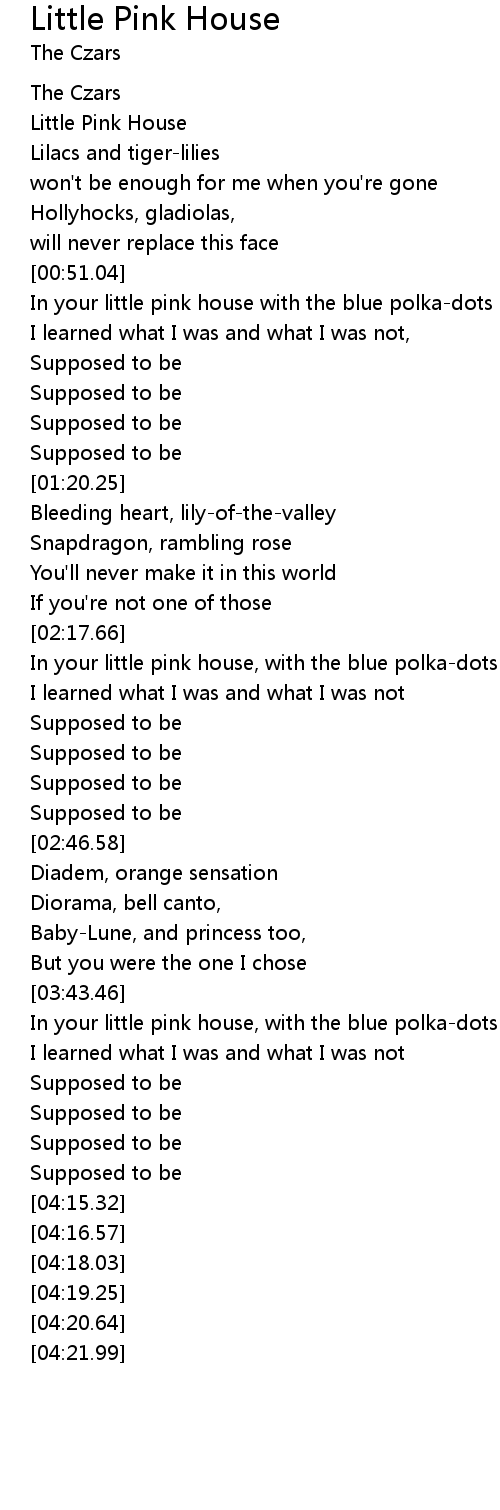 | [03:44.47] | In your little pink house, with the blue polka-dots |