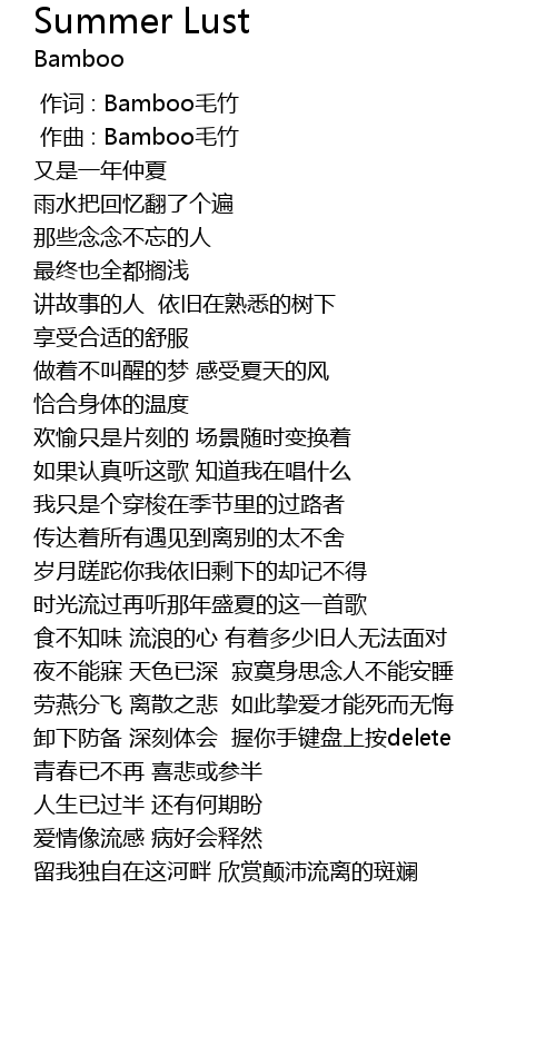 | [00:00.000] | 作词 : Bamboo毛竹 |
