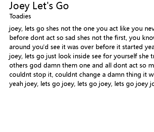 | joey, lets go shes not the one you act like you never seen anybody like that before dont act so sad shes not the first, you know and if you take a look around you'd see it was over before it started yeah joey, lets go joey, lets go joey, lets go just look inside see for yourself she treats you just like the others god damn them one and all dont act so mad get back into the car you couldnt stop it, couldnt change a damn thing it was over before it started(4x) yeah joey, lets go joey, lets go joey, lets go joey joey joey joey, yeah lets go |
