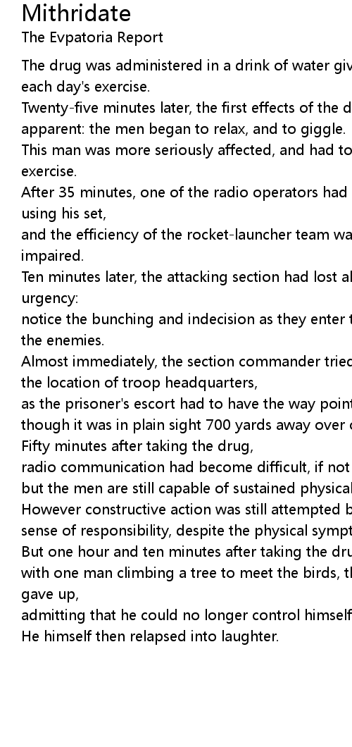 Twenty-five minutes later, the first effects of the drug became apparent: the men began to relax, and to giggle. |