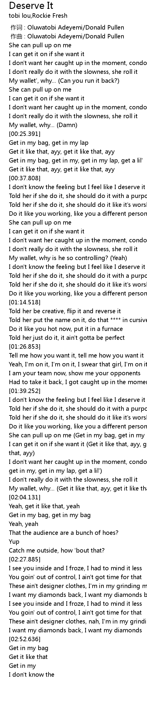 | [01:55.418] | I don't want her caught up in the moment, condone it (Get in my bag, get in my, get in my lap, get a lil') |