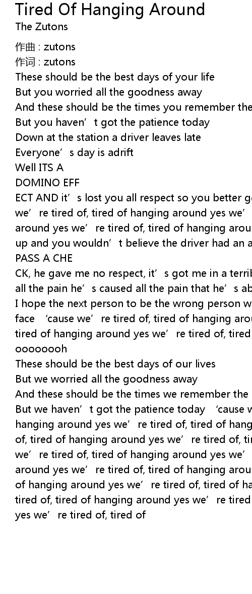 | I hope the next person to be the wrong person will wipe that stupid look off his face ' cause we' re tired of, tired of hanging around yes we' re tired of, tired of hanging around yes we' re tired of, tired of hanging around oh oooooooh | |