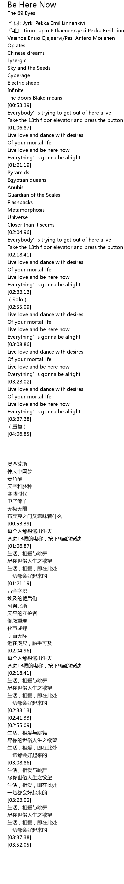 | [00:01.00] | zuo qu : Timo Tapio Pitkaenen Jyrki Pekka Emil Linnankivi Arto Vaeinoe Ensio Ojajaervi Pasi Antero Moilanen |