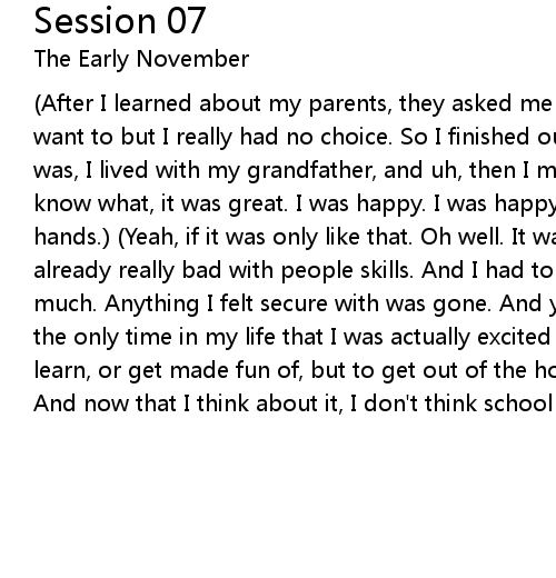 (After I learned about my parents, they asked me to live with them. And I didn't want to but I really had no choice. So I finished out the school year, where I was, I lived with my grandfather, and uh, then I moved in with them. And you know what, it was great. I was happy. I was happy and I knew it. I clapped my hands.) (Yeah, if it was only like that. Oh well. It was hard then, and I was already really bad with people skills. And I had to start all over again pretty much. Anything I felt secure with was gone. And you know what it was probably the only time in my life that I was actually excited to go to school. Not to learn, or get made fun of, but to get out of the house and get away from them. And now that I think about it, I don't think school was any easier.) |