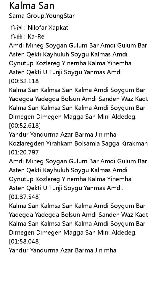 | [01:41.298] | Kalma San Kalmsa San Kalma Amdi Soygum Bar |