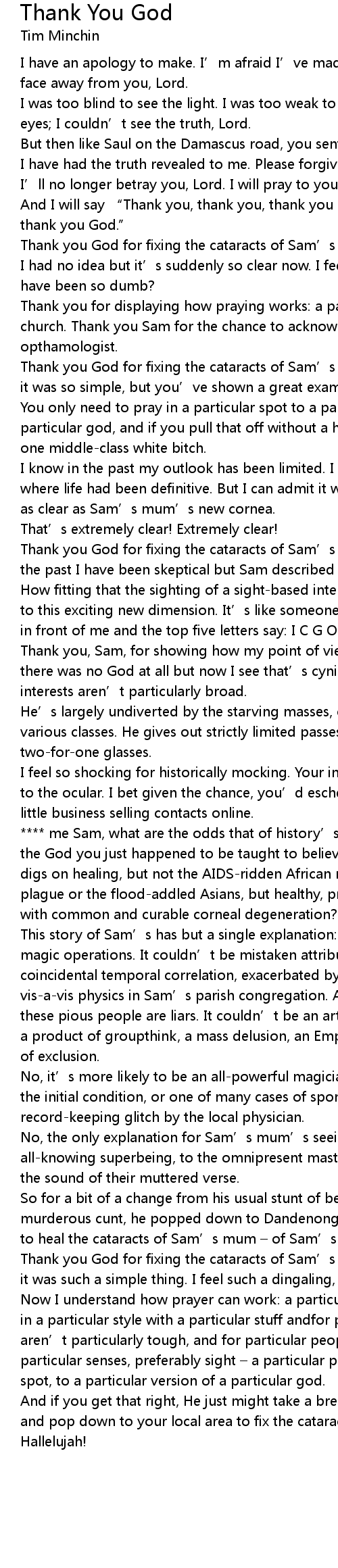 | **** me Sam, what are the odds that of history’s endless parade of gods that the God you just happened to be taught to believe in is the actual one and he digs on healing, but not the AIDS-ridden African nations, the victims of the plague or the flood-addled Asians, but healthy, privately-insured Australians with common and curable corneal degeneration? | |