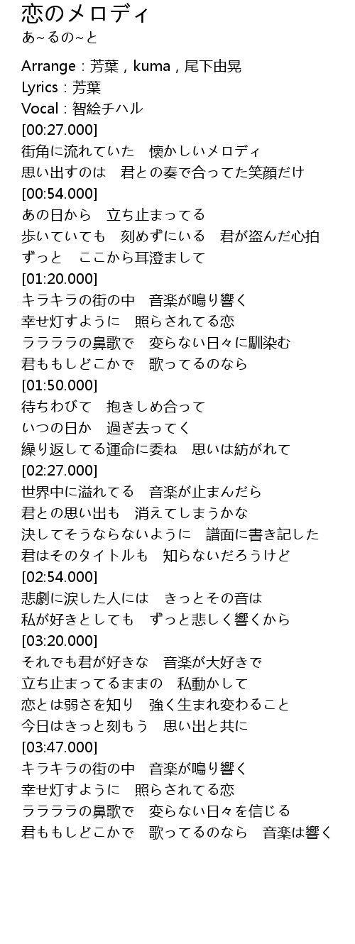 | [00:28.000] | 街角に流れていた 懐かしいメロディ |
