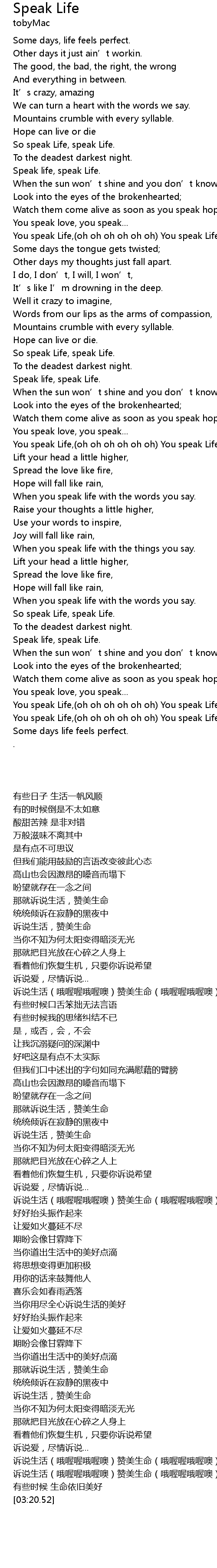 | [02:53.48] | You speak Life, oh oh oh oh oh oh You speak Life. oh oh oh oh oh oh |