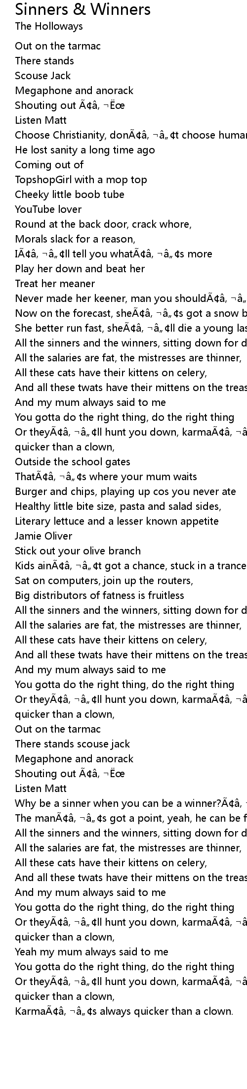 | Or they ll hunt you down, karma s always quicker than a clown, | |
