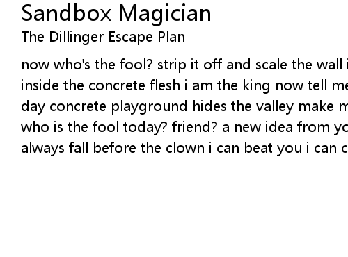 | now who's the fool? strip it off and scale the wall i am the mask that talks inside the concrete flesh i am the king now tell me nothing i am the fool for a day concrete playground hides the valley make me the king so i can strip it off who is the fool today? friend? a new idea from your stagnant mind and you must always fall before the clown i can beat you i can cheat you can i be you? |