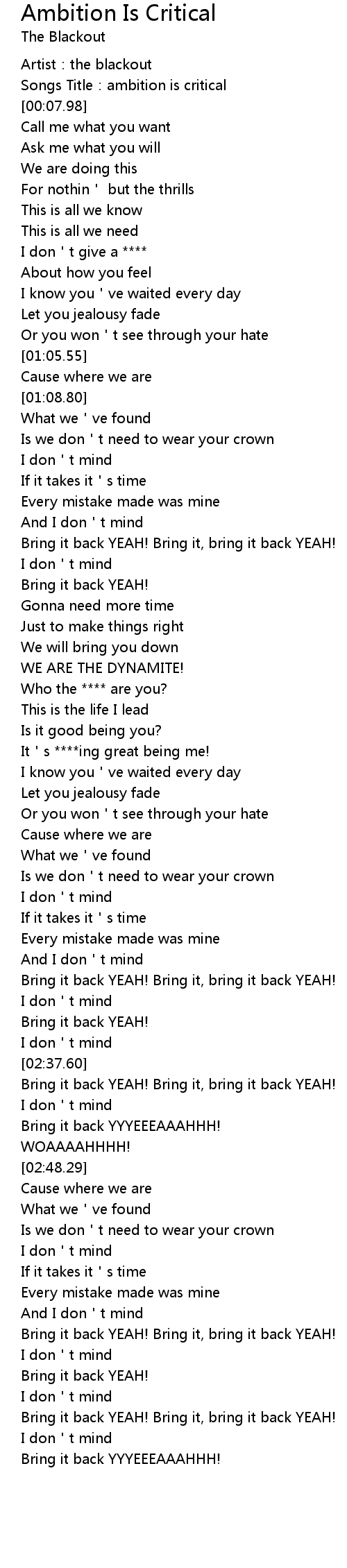 | [00:03.86] | Songs Title: ambition is critical |