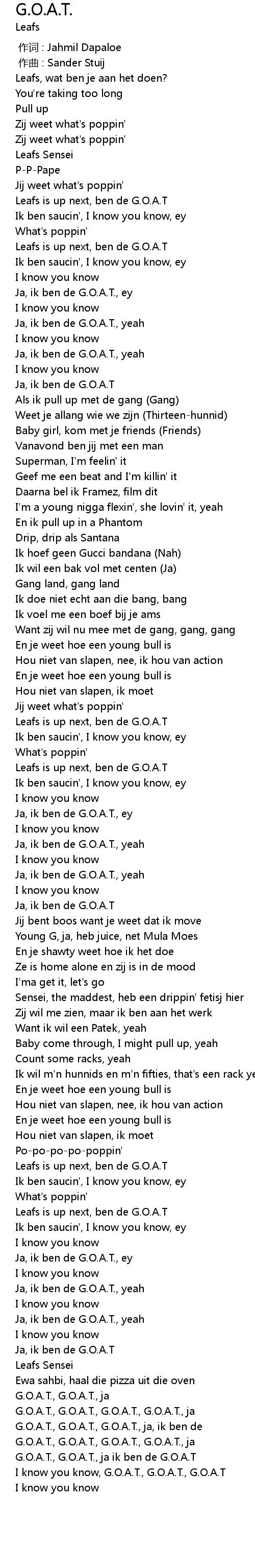 | [03:13.74] | G.O.A.T., G.O.A.T., ja ik ben de G.O.A.T |