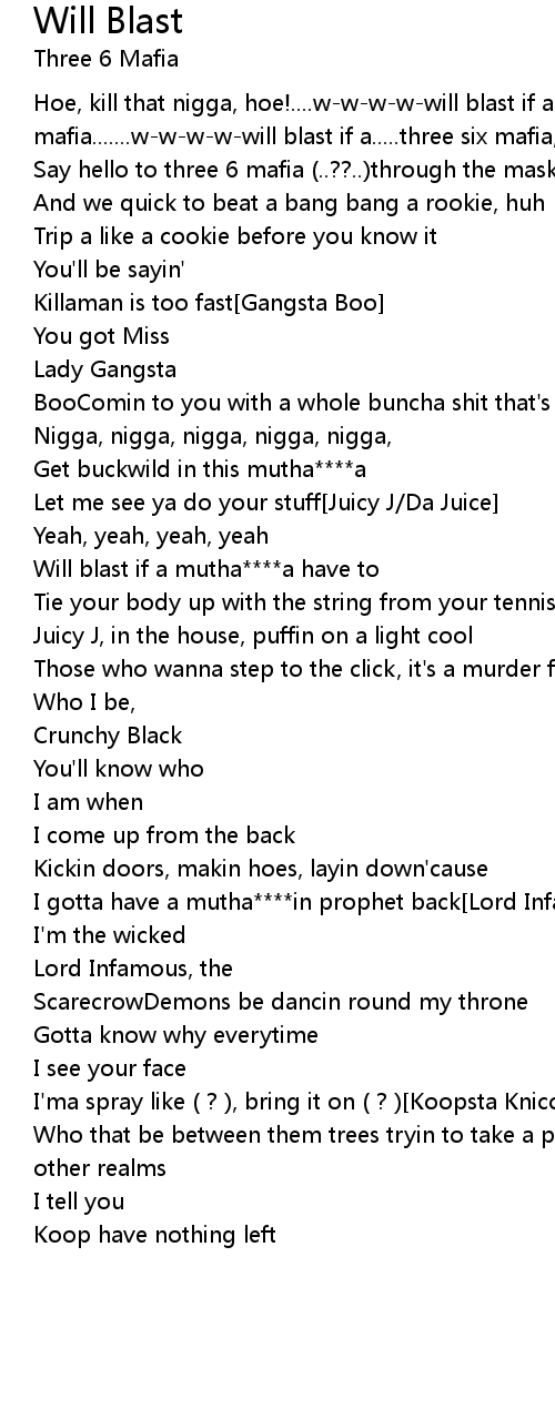 Hoe, kill that nigga, hoe!....w-w-w-w-will blast if a.....three six mafia, mafia.......w-w-w-w-will blast if a.....three six mafia, mafia...[DJ Paul] |