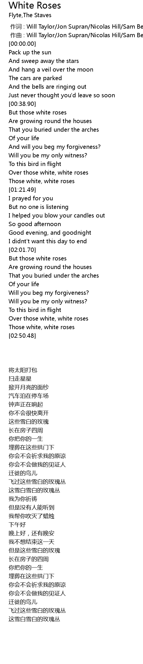 | [02:36.30] | Over those white, white roses |