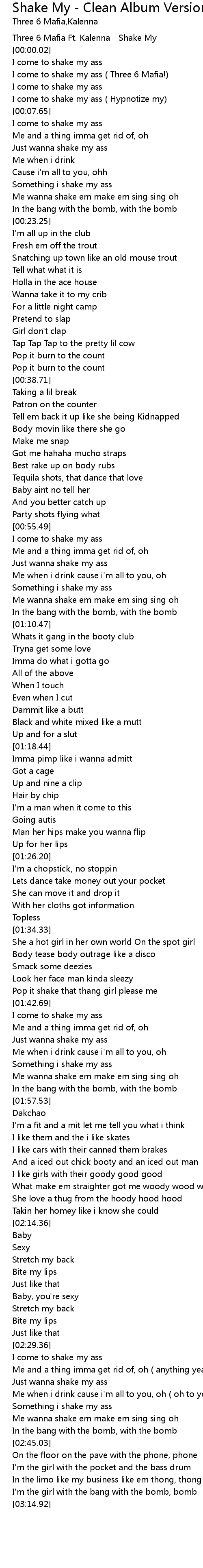 | [00:02.56] | I come to shake my ass ( Three 6 Mafia!) |