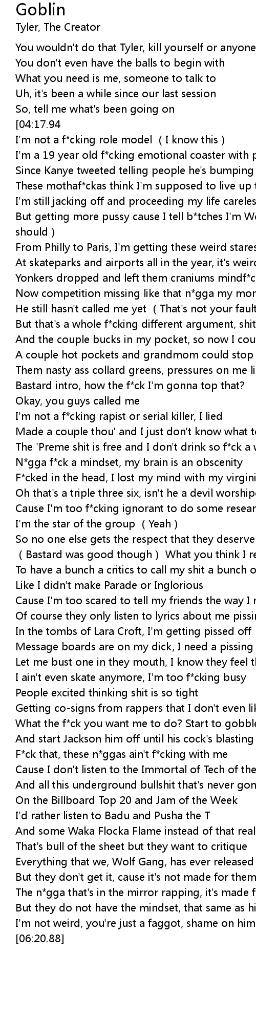 | [06:10.73] | I' m not weird, you' re just a faggot, shame on him |
