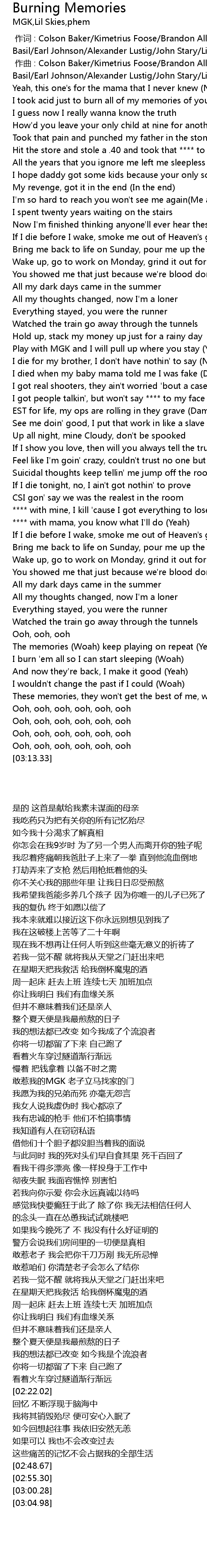 | [02:29.88] | I burn ' em all so I can start sleeping Woah |