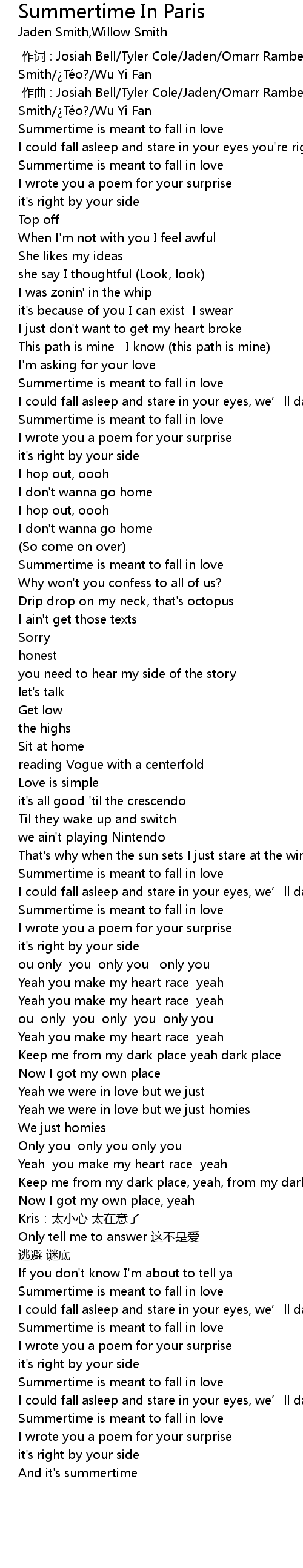 | [00:00.000] | 作词 : Josiah Bell/Tyler Cole/Jaden/Omarr Rambert/Willow Smith/¿Téo?/Wu Yi Fan |