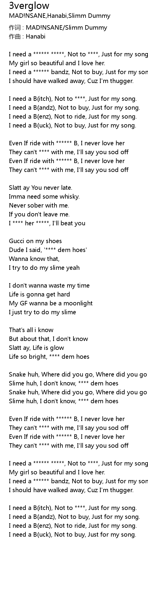 | I need a B(itch), Not to ****, Just for my song. | |