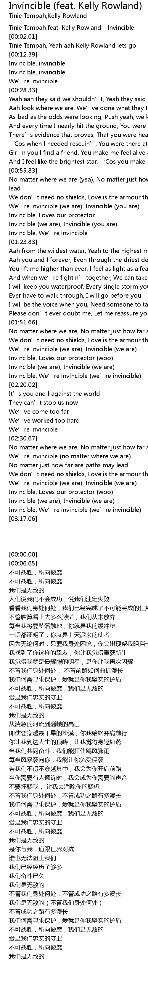 | [00:00.00] | Tinie Tempah feat. Kelly Rowland - Invincible |