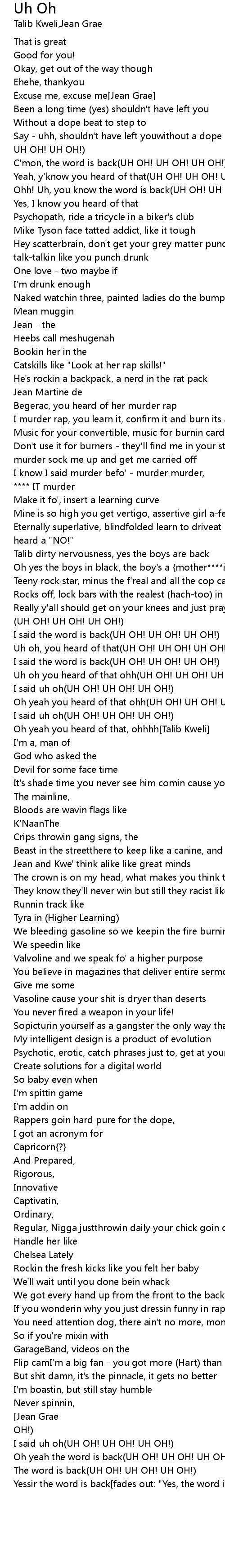 I'm always coastin[Chorus - first half with ad libs][Jean Grae](UH OH! UH OH! UH OH!) |