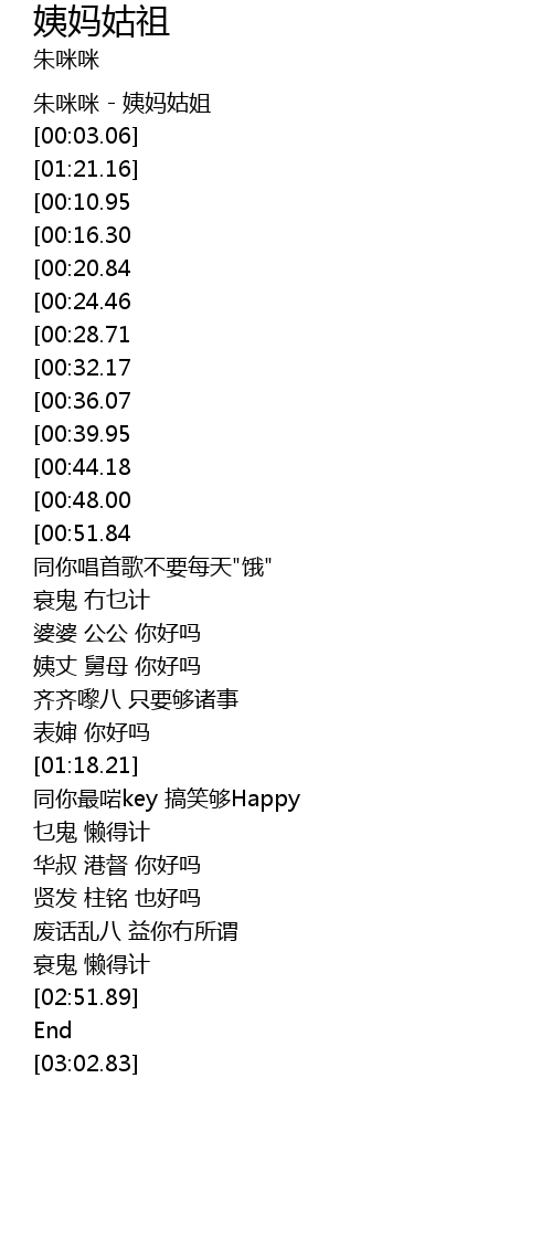 | [00:00.00] | 朱咪咪 - 姨妈姑姐 |