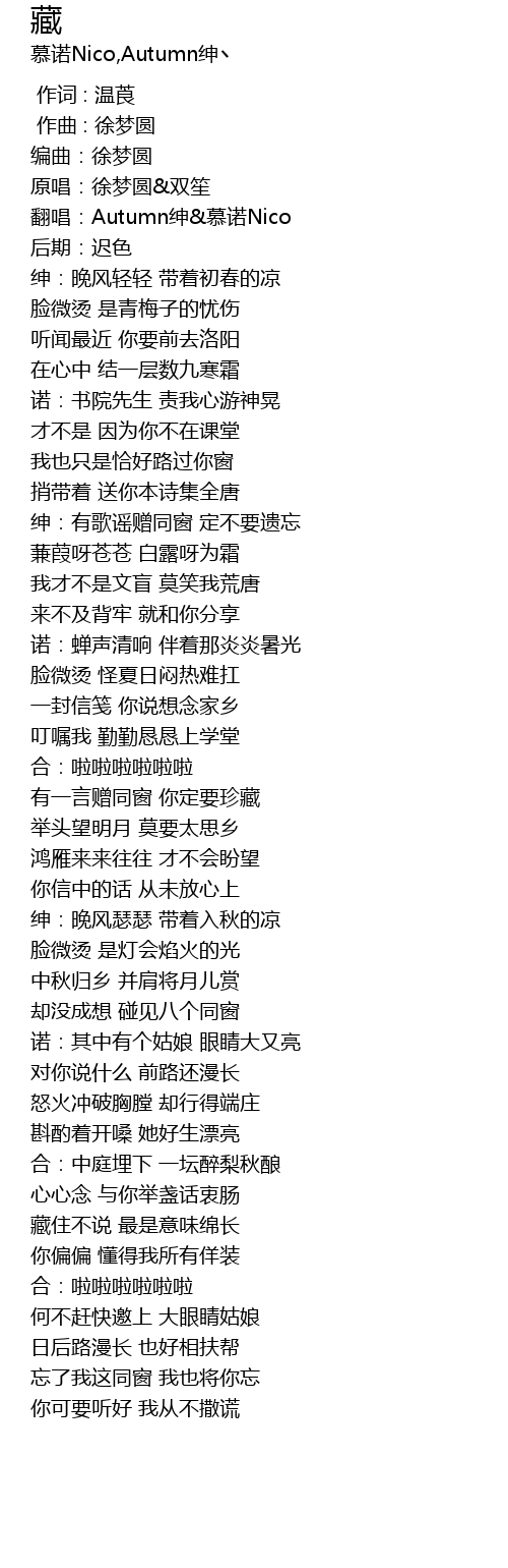 | [00:00.54] | 翻唱:Autumn绅&慕诺Nico |