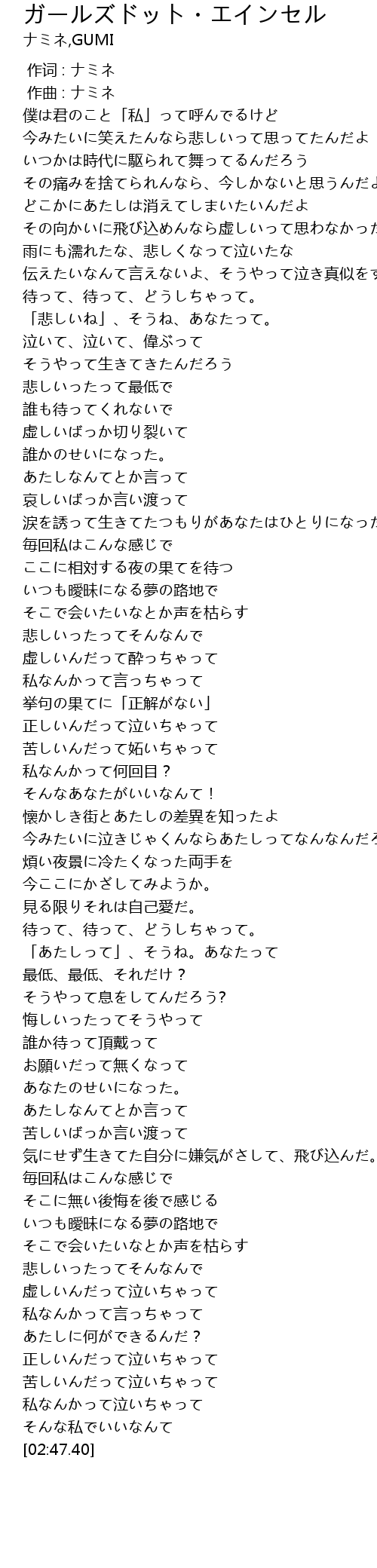 | [02:37.46] | あたしに何ができるんだ? |