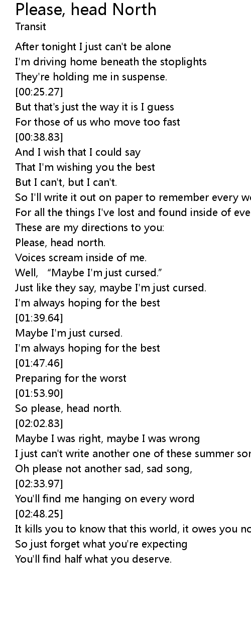 | [00:15.45] | I'm driving home beneath the stoplights |
