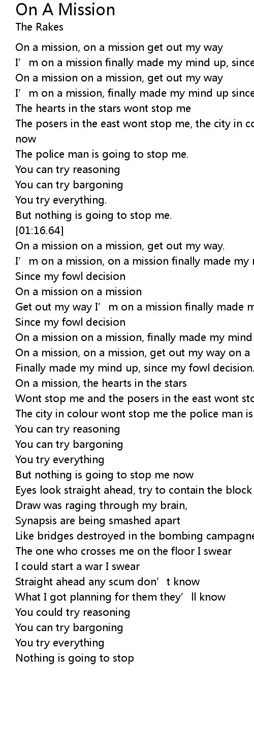 | [01:19.63] | I' m on a mission, on a mission finally made my mind up |