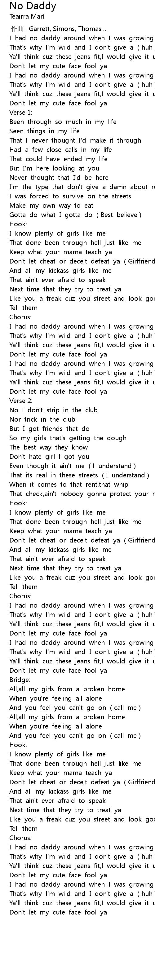 | [00:28.03] | I had no daddy around when I was growing up (huh) |
