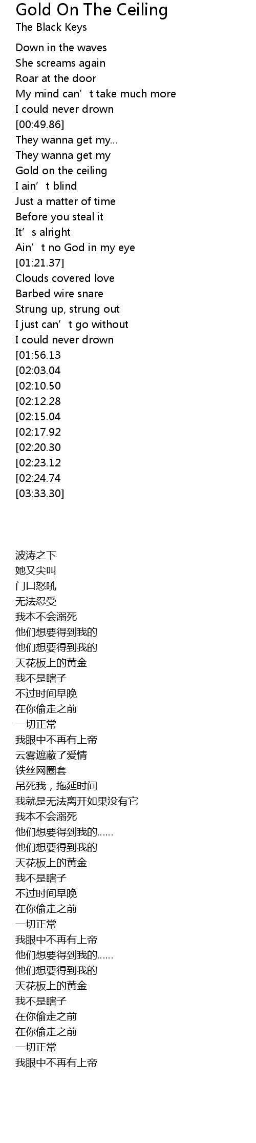 | [02:56.69][02:12.28] | Gold on the ceiling |