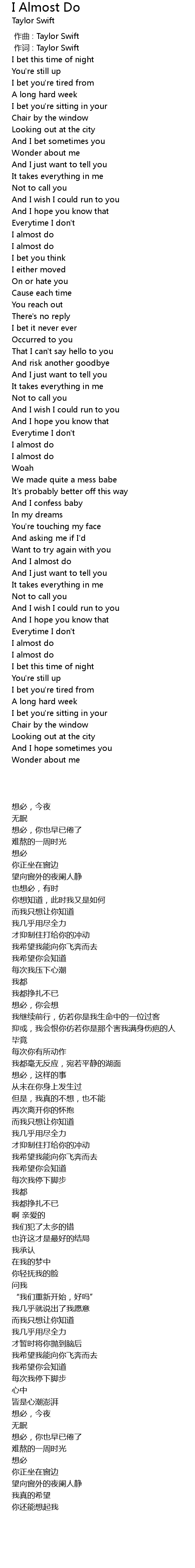 | [00:01.00] | 作词 : Taylor Swift |