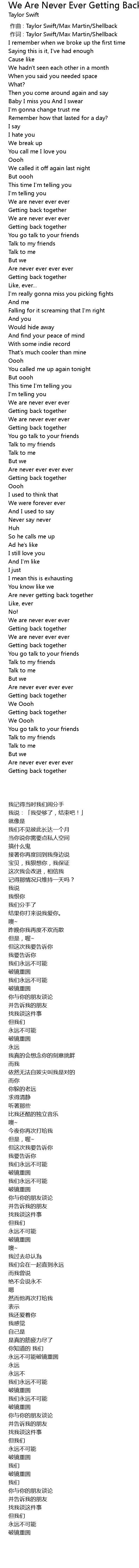 | [00:01.00] | 作词 : Taylor Swift/Max Martin/Shellback |