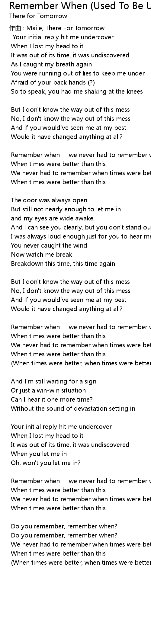 | Remember when we never had to remember when times were better | |
