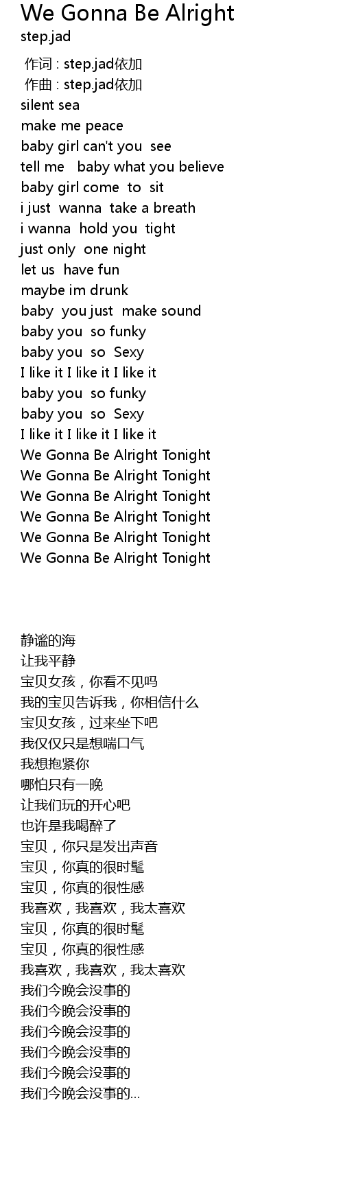 | [01:43.484] | We Gonna Be Alright Tonight |