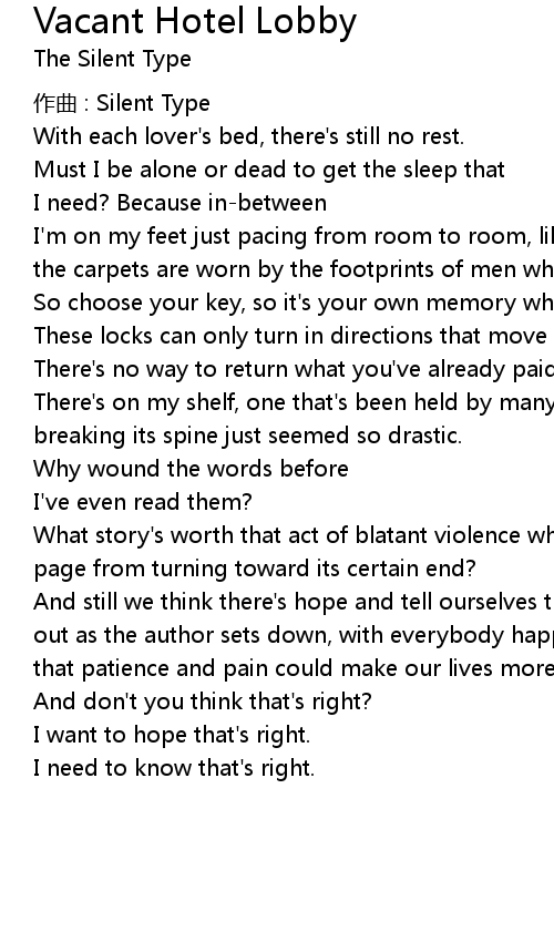 | I' m on my feet just pacing from room to room, like some vacant hotel lobby where the carpets are worn by the footprints of men who' ve paced before me. | |