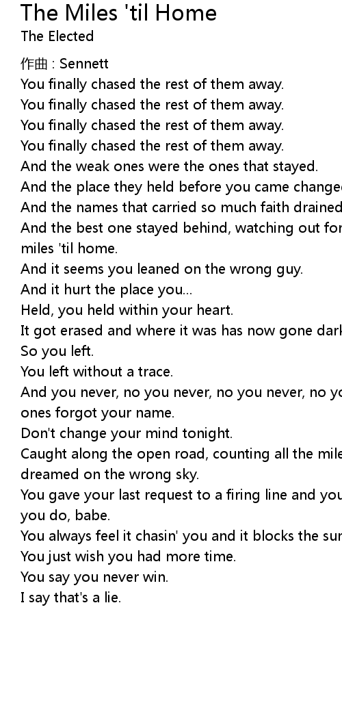| Song | The Miles 'til Home |