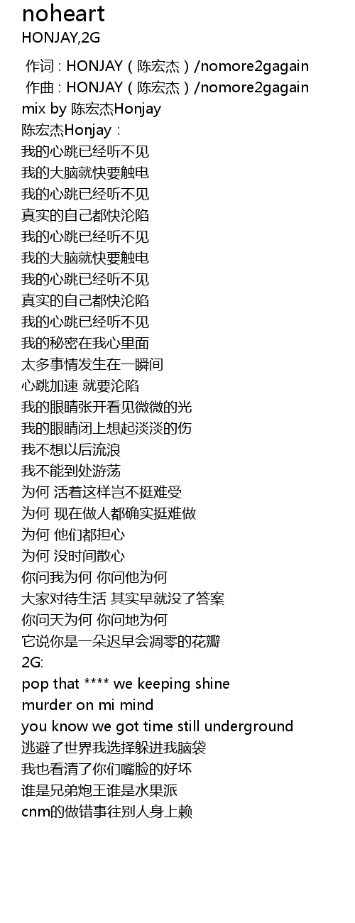 | [00:00.000] | 作词 : HONJAY(陈宏杰)/nomore2gagain |