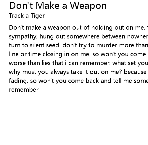 Don't make a weapon out of holding out on me. there's nothing left but your sad sympathy. hung out somewhere between nowhere and goodbye. don't let you fear turn to silent seed. don't try to murder more than you and i need. there is no line or time closing in on me. so won't you come back and tell me something worse than lies that i can remember. what set you off today i could not read? why must you always take it out on me? because i'm not strong with you and i'm fading. so won't you come back and tell me something worse than lies that i can remember |