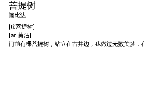 | [00:25.405] | 门前有棵菩提树,站立在古井边,我做过无数美梦,在它的绿荫间。也曾在那树干上,刻下甜蜜的话;无论快乐和痛苦,常在树下留连<133774,-152796,0>。 |