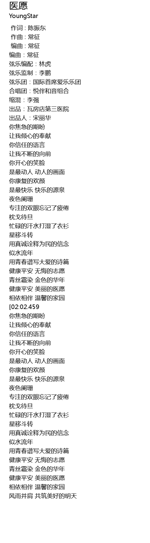 | [01:45.389] | 健康平安 美丽的医愿 |