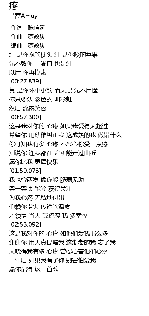 | [02:54.243] | 这是我对你的 心疼 如他们爱我那么多 |